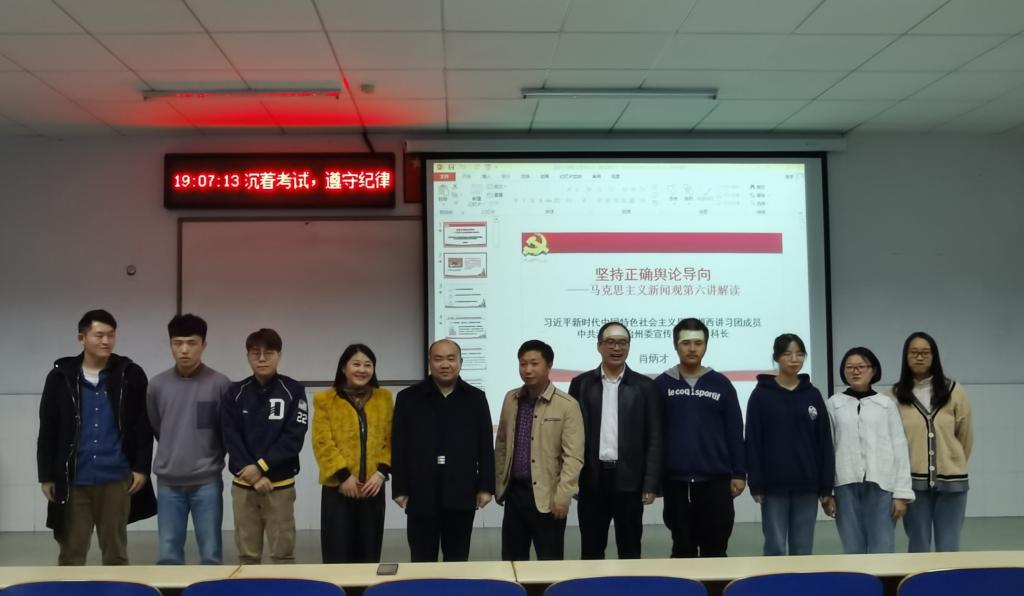 10月28日晚正式上课前,公司分管教学工作的彭广林副经理、“马克思主义新闻观”主讲教师徐晓红教授、新闻学专业前任主任李端生教授和部分听课员工代表在台前和肖科长合影。