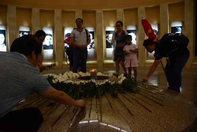 图为 在缅怀馆给烈士献花(刘欣然 摄)