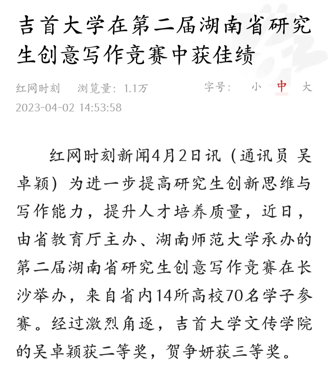 红网时刻新闻4月2日讯(通讯员 吴卓颖)为进一步提高研究生创新思维与写作能力,提升人才培养质量,近日,由省教育厅主办、湖南师范大学承办的第二届湖南省研究生创意写作竞赛在长沙举办,来自省内14所高校70名学子参赛。经过激烈角逐,bv伟德国际1946的吴卓颖获二等奖,贺争妍获三等奖。