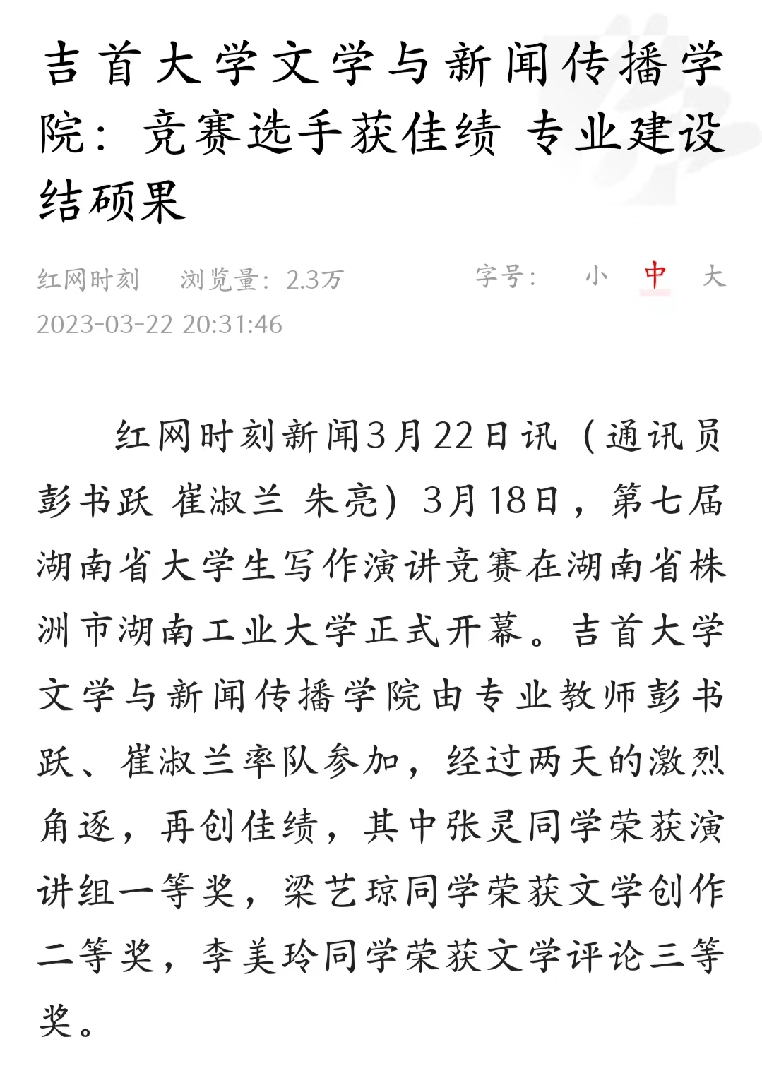 红网时刻新闻3月22日讯(通讯员 彭书跃 崔淑兰 朱亮)3月18日,第七届湖南省老员工写作演讲竞赛在湖南省株洲市湖南工业大学正式开幕。bv伟德国际1946由专业教师彭书跃、崔淑兰率队参加,经过两天的激烈角逐,再创佳绩,其中张灵同学荣获演讲组一等奖,梁艺琼同学荣获文学创作二等奖,李美玲同学荣获文学评论三等奖。