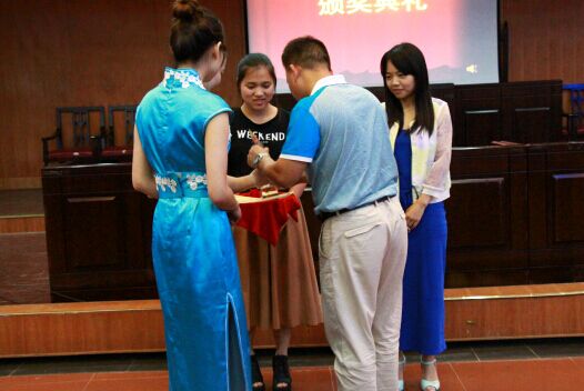 图为 颁奖过程 (安昭旭 摄) 吴有强获得品行奖;黄成云、宋林凤获得学习奖;胡晶晶、欧阳英豪获得创业奖;张晓眉、陈诗获得科研奖;薪传教育创业团队、精灵影视文化传媒有限公司创业团队获得创业奖。
