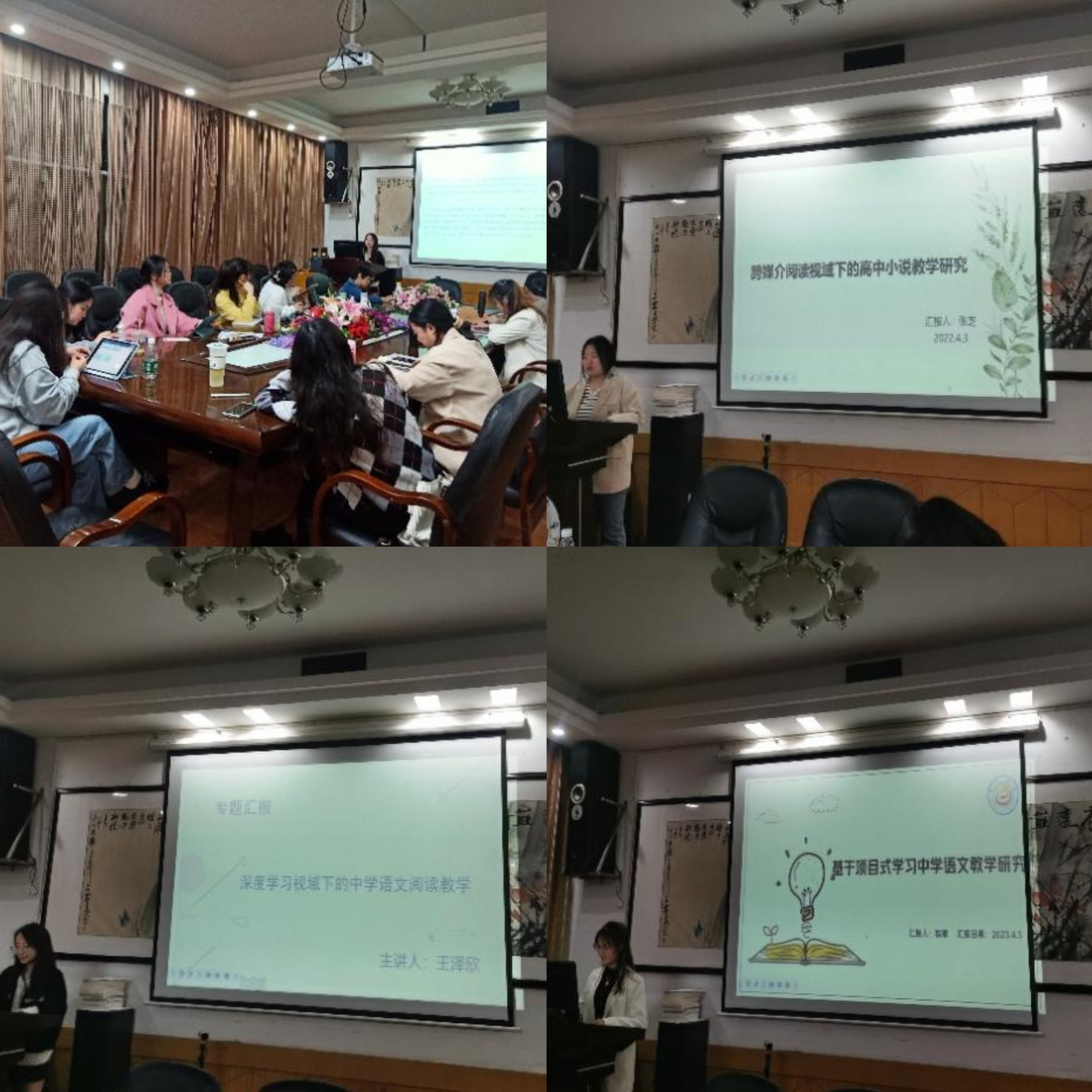 学科语文专业张芝分享的是“跨媒介阅读视域下的高中小说教学研究”这一专题,她从研究缘起、概念界定、研究现状、实施策略和自我收获五个方面展开汇报。她认为:“跨媒介阅读”只是一种学习方式和手段,并不是学习目的,教学的根本在于学习内容,要突出语文核心素养,不能为了跨媒体教学勉强为之。王泽欣分享的是“深度学习视域下的中学语文阅读教学”,她从概述、文献综述、实施策略和总结与思考四个方面展开汇报。她认为:深度学习着重锻炼员工的学习能力,促进高阶思维的发展,要符合核心素养培养目标要求。程银分享的是“基于项目式学习中学语文教学研究”,她从选题概述、文献综述、实施策略和个人思考四个方面展开汇报。她认为:项目化学习可在语文学科与员工语文素养之间铺设通路,需要我们不断地去学习、去突破、去成长。