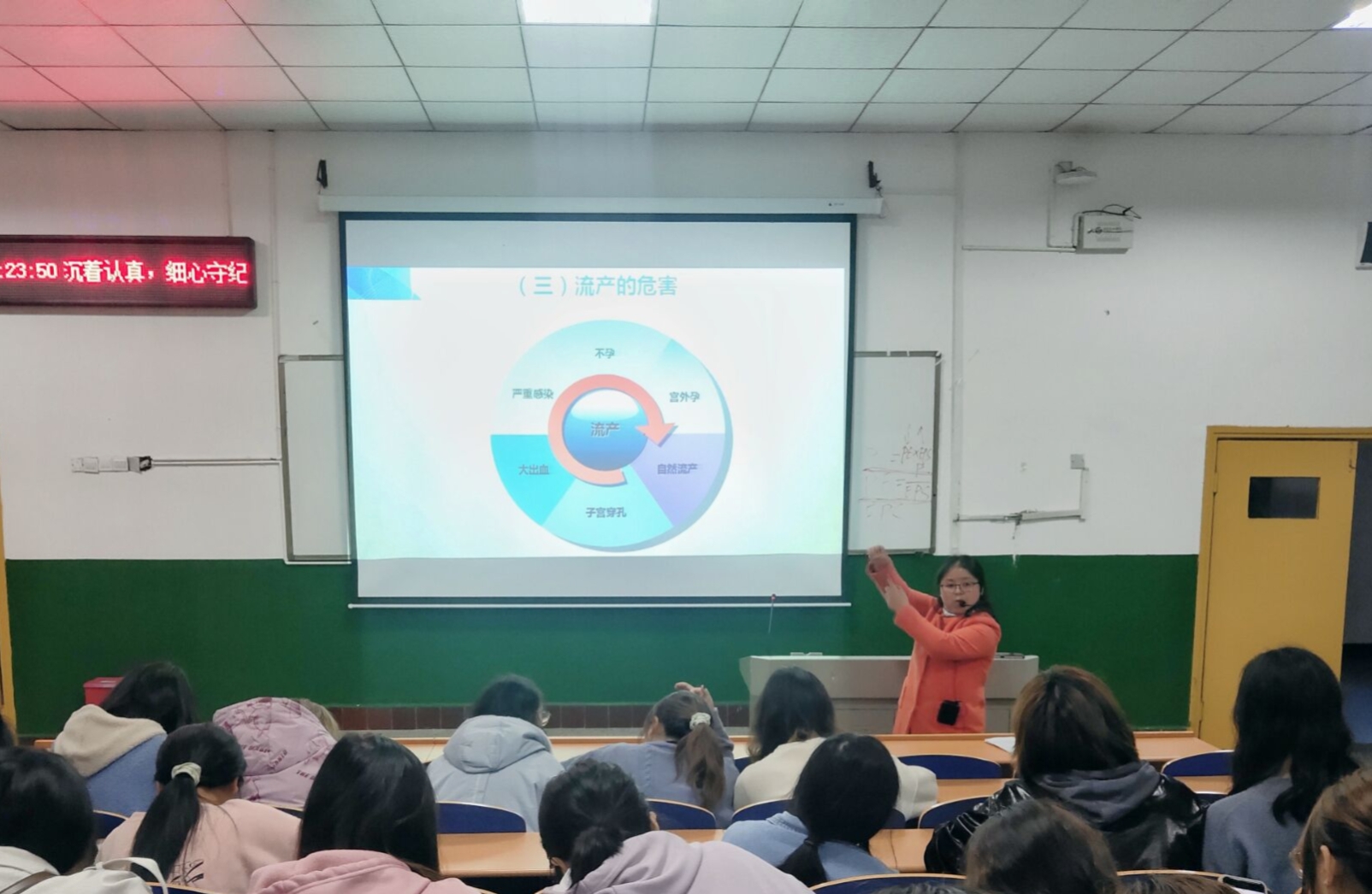 随后,她讲解流产的概念及分类,着重强调人工流产的危害性。在讲到安全套与避孕套的区别时,刘艳与同学们进行现场互动,得到了积极的反馈。
