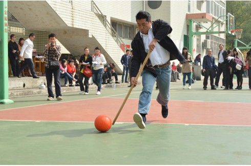 看,到公司党总支书记田茂军老师上场了,只见他手里拿着的棍子仿佛是活的一般,不断将球往前方赶去,他的眼神一直盯着地面和球,透露出很认真的表情。转眼间,球便到了转弯的桩子处了,只见田老师小心的用棍子将球轻轻的转过桩子,用力往前一击,球便加速往前滚,此时田老师也加快了脚步,继续赶着球,终于到终点了,田老师也停下了急骤的步伐,站定露出了轻松的笑容并且和周围的老师进行着轻松的交谈。看来,趣味运动会的确给老师们平时紧张的生活带来了欢乐与放松。