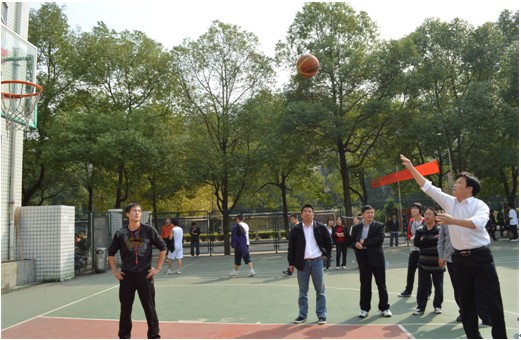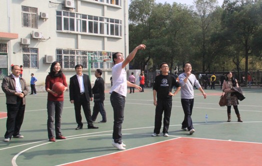 刚参加完本届校运会教职工组的趣味螃蟹接力跑比赛,彭老师便迫不及待的加入了另一场“比赛”——与员工们一起打起蓝球来。彭老师打起球来十分认真,但最吸引人的却是他嘴角从未消失的微笑。无论是自己进了球,还是不小心失误了,他的微笑总是不会停下的。打到兴头上还不时的来点呼喊呐喊,此时他的笑也变得更加爽朗了。也许被彭老师快乐和微笑感染了,场上场下的人嘴边都会不由自主的露出微笑。