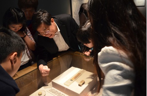 图为 罗惠缙经理与同学们一起研究藏品 (廖艳凤 摄)