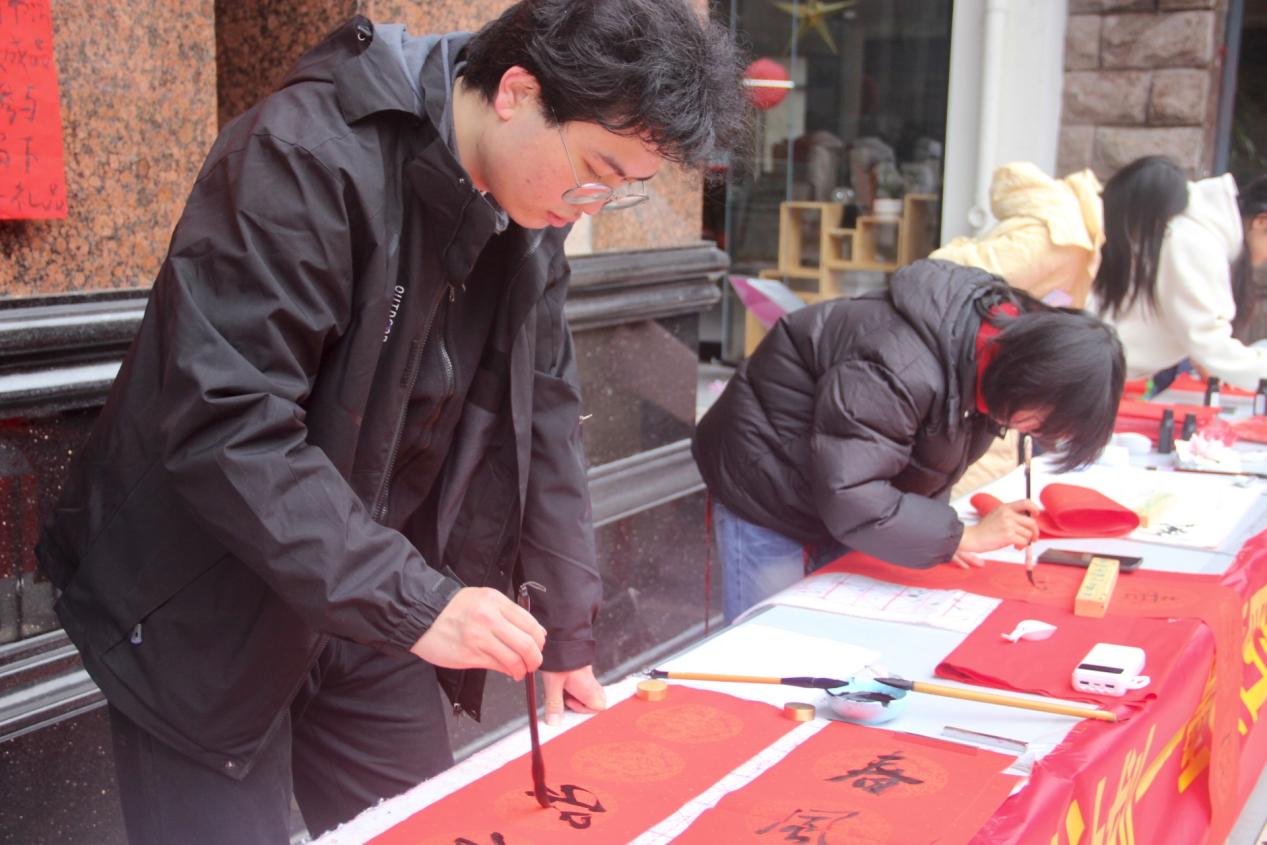 活动现场墨香飘溢,气氛热烈。同学们踊跃参与,挥毫泼墨,一幅幅寓意吉祥、笔力劲挺的对联在笔端完成。书写台前围满了观摩学习的同学,部分同学自发求字互赠,大家相互交流,切磋技艺,在实践中沉浸式感受书法艺术的魅力,现场体现出浓郁的传统文化氛围与节日气息。