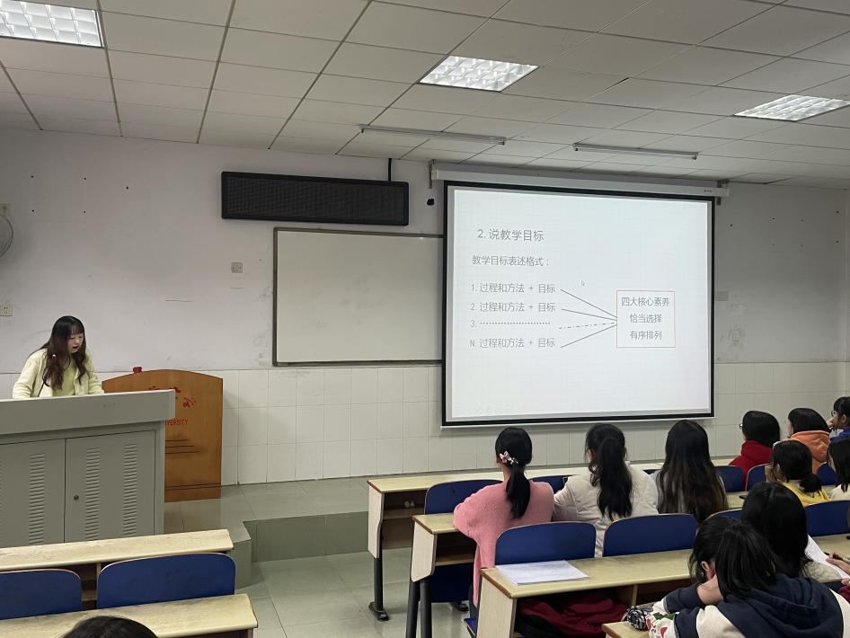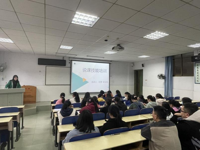 研究生党支部党员、2020级学科语文专业研究生石雯、徐云昆作为说课培训主讲人,围绕“该如何讲好一堂课”、“讲好一堂课需要准备什么内容”、“需要用到哪些技巧”等问题展开了详细的讲解。此外,她们又从说教材、说员工,说教学目标,说教学重难点,说教法学法,说教学流程,说版书设计六个层面叙述了说课的内容与教学要求。