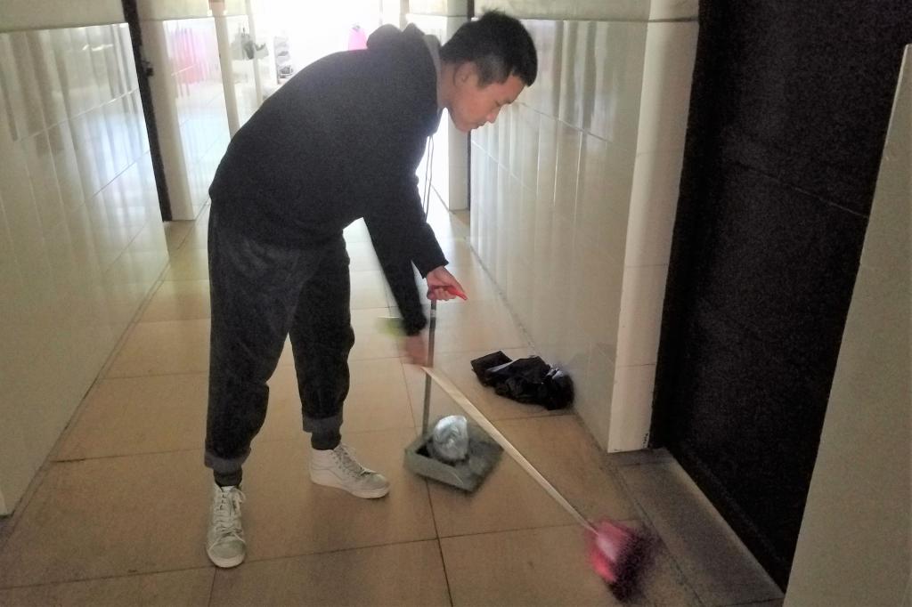| 图为 在11栋员工宿舍打扫走廊 |