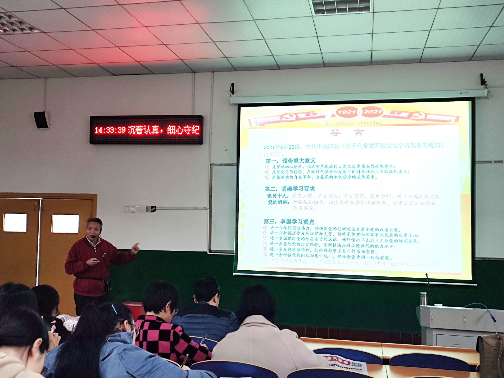 党课伊始,石维海带领参会党员明确了党史学习四要求:领会学习党史重大意义;明确学习党史要求;掌握学习党史重点;注重党史学习方法。他还从“立党三问主,辉煌一百年”“立党三问根,百年造辉煌”“立党三问计,伟业永辉煌”三个方面讲解党史,带领师生党员们学会如何把握党发展的脉络,以深刻领会党各时期的发展纲领、历史精神。