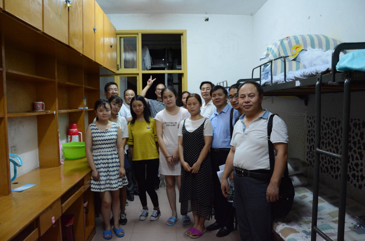 随后,一行人在2017级辅导员刘建新的带领下来到女生宿舍六栋。当天晚上天气闷热,辗转多个寝室,领导老师们的衣服早已被汗浸湿,却没有忽略每一个新生宿舍,“是哪里人呢?”、“什么时候到的?”“坐了多久的车呢?家长陪同来的还是自己来的呢?”领导老师们一遍又一遍地亲切询问,新生们也大方地向老师们介绍自己,向老师们了解自己的专业,介绍自己的家乡等等。在了解到公司女生住在6至8楼,罗经理表示希望她们能够克服高楼层困难,好好适应老员工活。田书记在看望8楼的新生时幽默地说“住最高层可以每天爬楼梯锻炼锻炼身体。”现场交谈氛围热闹融洽。