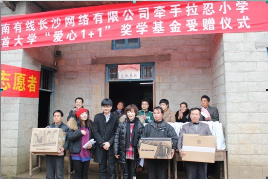 受赠仪式分物资捐赠和代表讲话两大部分。湖南有线长沙网络有限公司向拉忍小学捐赠了价值一万多元的物资和16000余元现金,总计捐赠32833.2元人民币。