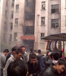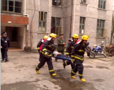 演习地点位于1、2栋男寝,由保卫处人员施放烟雾弹模拟火灾现场。下午2时许演习正式开始,同学们用毛巾捂住口鼻,弯着身子纷纷有序地从楼道里跑出,场面井然有序。随后消防队员冲进“火场”将“伤员”用担架抬出,送往救护车。整个演习耗时约十分钟,顺利结束。