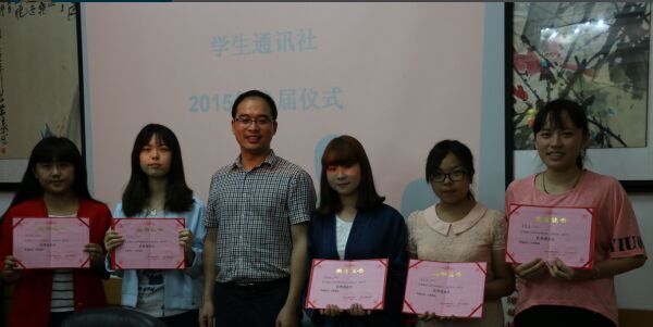 图为 彭广林老师与优秀通讯员合影(夏慧琳 摄) 主持人宣读2014—2015学年学通社表彰名单,包括优秀员工记者、优秀通讯员,并由彭广林老师颁发荣誉证书。此后,彭广林老师发言,他告诫学通社成员们,对待工作要认真、积极,要有毅力,能够坚持,要正确看待记者工作的困难,并在不断的磨练中成长。
