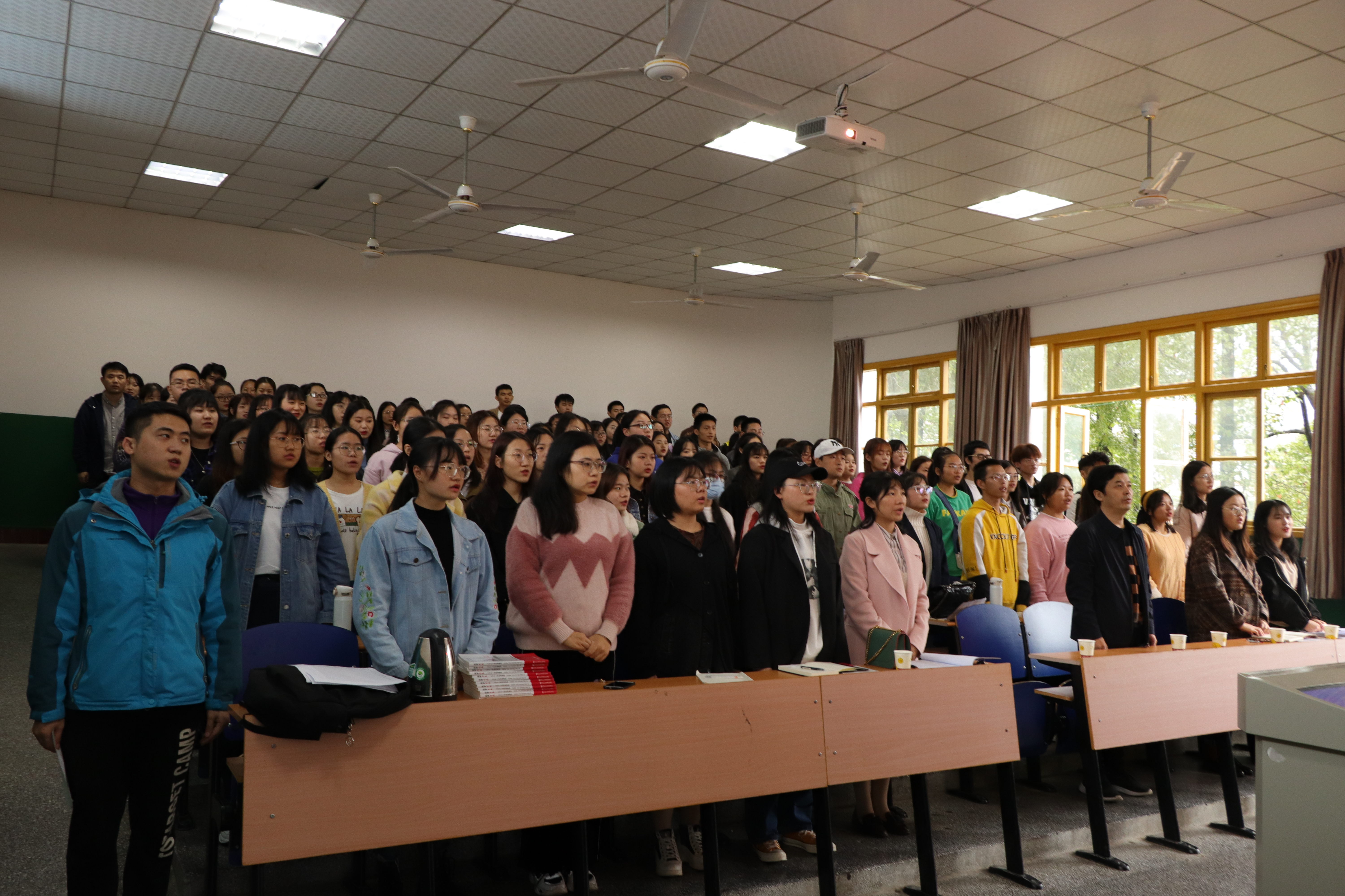 典礼开始后,全体师生奏唱国歌。研究生支部19级刘书苑同学代表全体学员发言,她讲述入党的积极意义,倡议大家思想向党靠拢、行为向党学习,贯彻习近平总书记考察湖南的重要讲话精神。