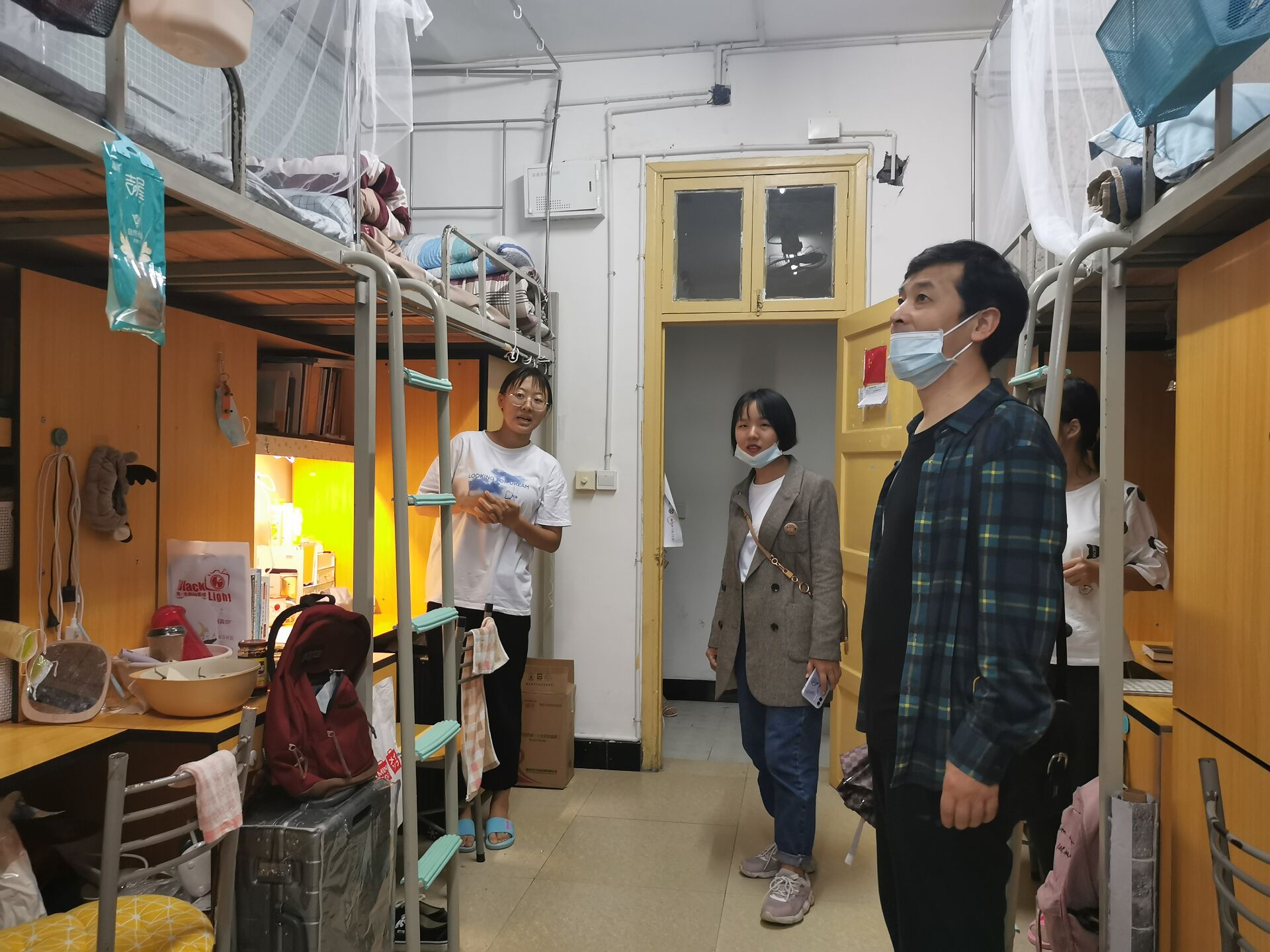 杨龙斌、杜靖一行和罗惠缙、段武城一行分别前往公司宿舍3栋和11栋各寝室慰问员工。期间,杨龙斌检查了宿舍卫生和用电安全,询问是否有被子发霉等情况发生,提醒员工要有风险意识。最后,他叮嘱员工,遇到难以解决的问题,要及时向院领导、学工办老师以及辅导员寻求帮助。