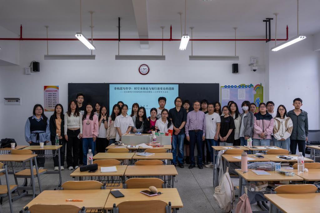 讲座尾声,马正平总结强调:“灵感是瞬间审美、回溯与复兴思维的合一,文学的最高境界在于美,而审美教育需基于具身性思维模型。”他指出,非构思写作学作为生成式、开放式的写作方式,既能彰显文本的原创性,又可深度还原作者的创作心理图景,为写作学科发展开辟了新维度。讲座结束后,佘佐辰与刘泰然就非构思写作学的实践应用等问题与马正平进行了深入交流。多位同学表示,通过本次讲座对写作思维有了新的认识,将在今后的创作中尝试运用相关理论方法。