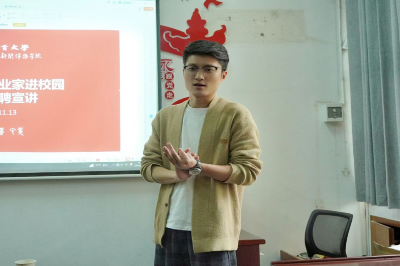 邱建结合历年来校招聘情况,介绍了公司部分毕业生就业成功典型案例,鼓励同学尝试直播这一新兴职业。此外,邱建围绕公司的福利待遇、运营辅导、工作条件等核心问题进行了全面阐述,使同学们对自媒体行业的招聘需求以及职业发展路径有了更加清晰和深入的了解,为同学们未来的职业规划提供了宝贵的参考信息。